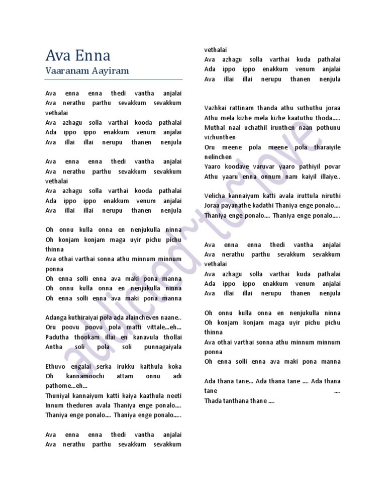 Ava Enna Enna Thedi Lyrics : #avaennaennathedivanthaanjala #surya #lovepain ava enna enna thedi vantha anjala status varanam aayiram gautam vasudev menon please like and share this video subscribe and press bell icon for more updates.